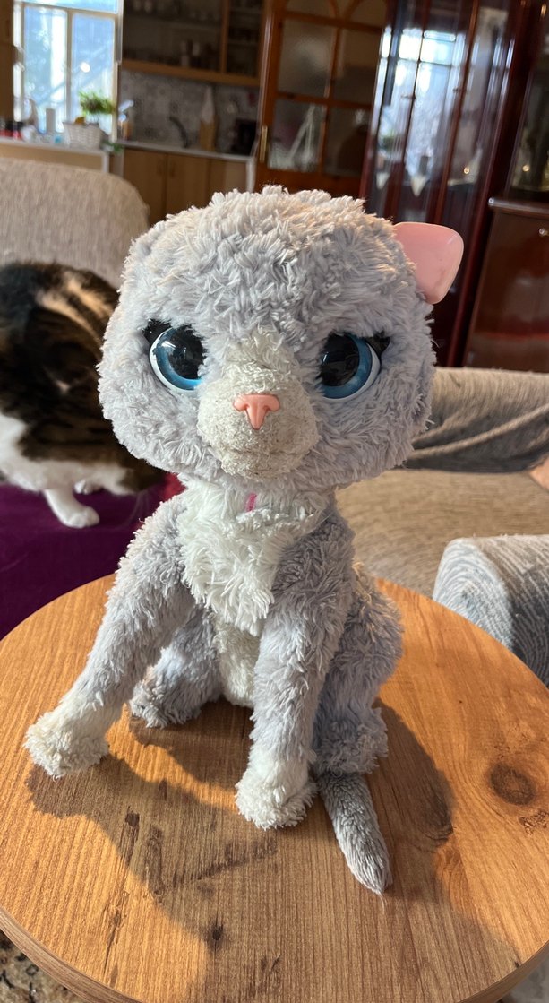 Yumuşak ve gri peluş kedi oyuncağı, büyük mavi gözler ve pembe burun ile. Kabartmalı dokusu ve sevimli tasarımıyla dikkat çeker. Sağ bacağı kırık kulağı yok pil yeri temiz taktım çalışmadı anlayan kişi tamir edebilir