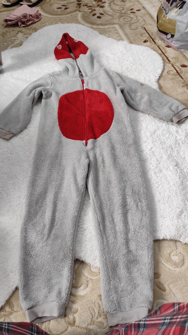 Gri, peluş dokulu kapüşonlu kedi tulumu, yıkandığı zaman cikicak lekeleri mevcud . kol kısmında kalem lekeleri var