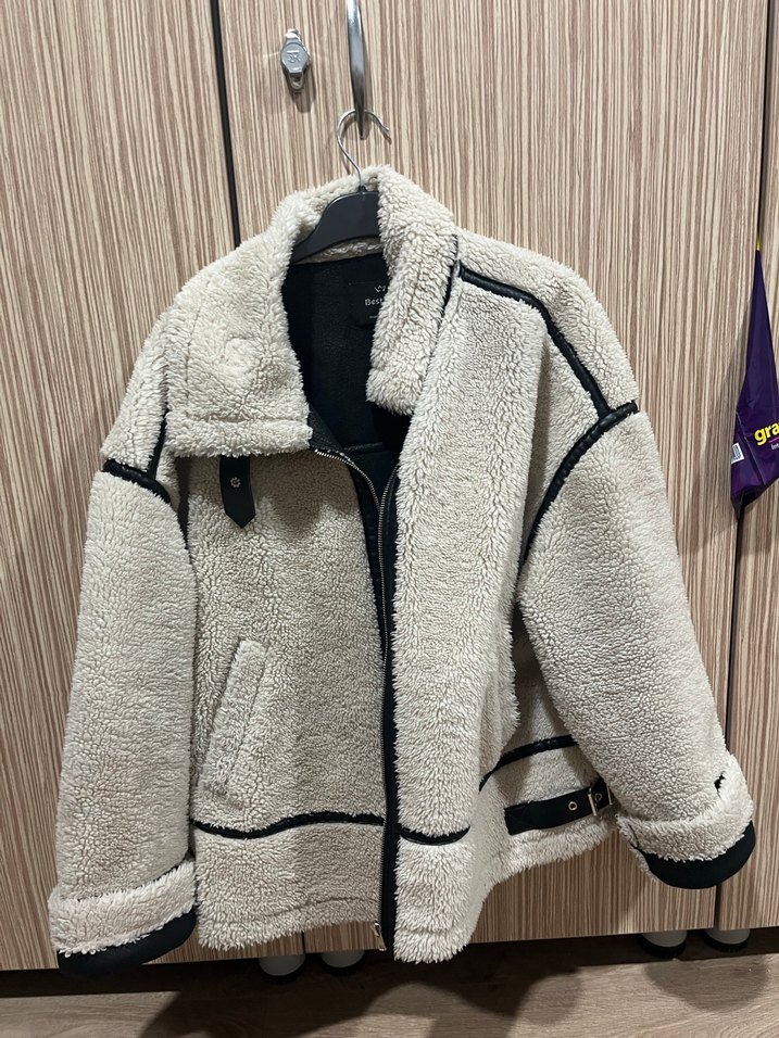 Kadınlar için kısa, bol kesim ve uzun kollu ceket. Yumuşak peluş malzeme ve kürk detaylarıyla gri renkte rahat sokak stili sunar.