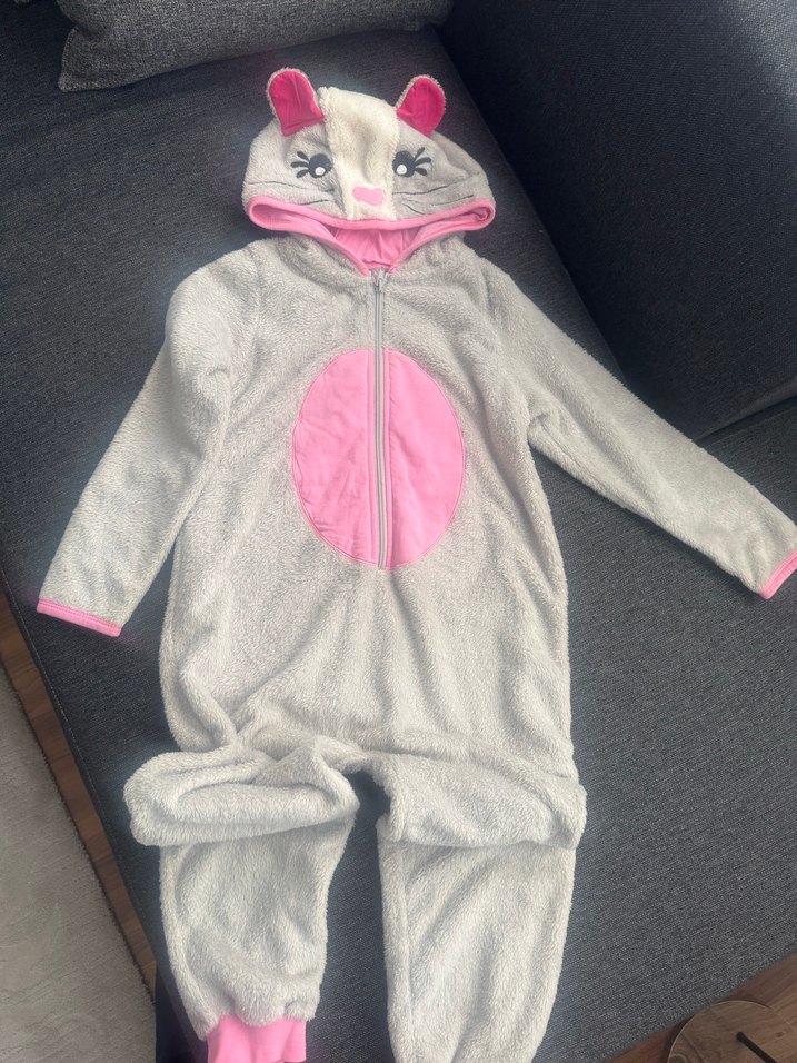 Gri peluş kumaştan, uzun kollu, kapüşonlu kız çocuk uyku tulumu. Kulak ve yüz detayları ile sevimli tasarım, pembe oval ön cep ve manşetler içerir. Pembe kısmında ufak bir sarı leke var belli belirsiz 5. Resme bakabilirsiniz 6-7 yaş
