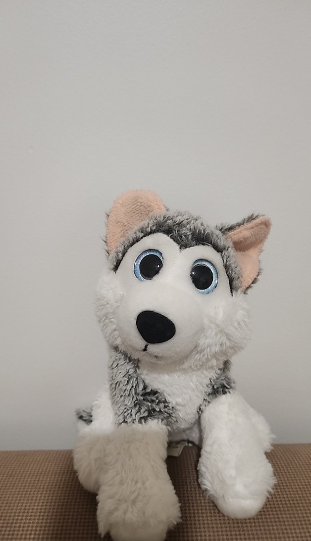 Büyük mavi gözlere ve pembe iç kulaklara sahip yumuşak gri-beyaz peluş kurt oyuncak.sorunsuzdur