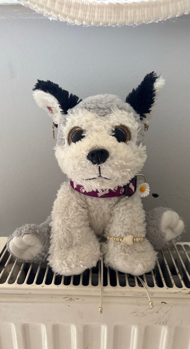 Büyük gözlü, mor çiçek desenli tasmalı yumuşak gri peluş köpek oyuncağı. Biraz eski essa kurdu şimdiden alacak işe hayırlı olsun