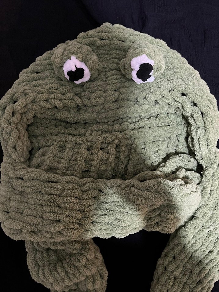 Yumuşak dokulu kumaştan yapılmış, büyük gözlü gri peluş kurbağa balaklava. istenilen ölçüde ve renkte sipariş üzerine yapılır.