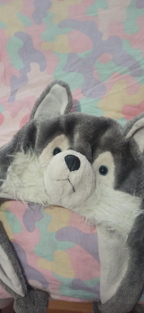 Yumuşak gri peluş kurt şapka, detaylı yüz özellikleri ve kabarık dokuya sahip, 4 yaşa kadar oluyor