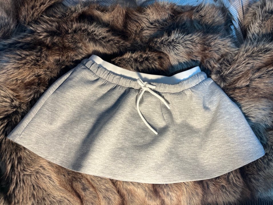 Gri renkte, peluş kumaştan yapılmış, bol kesim ve kürk detaylı mini etek, günlük rahat kullanım için uygundur.