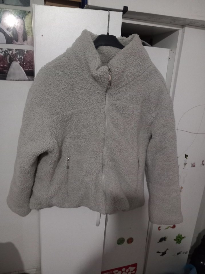 Gri renkli, kısa boy kadın ceketi yüksek yakalı ve uzun kolludur. Yumuşak, peluş kumaştan yapılmış ve kürk detaylıdır. Rahat kesimiyle günlük kullanıma uygundur.