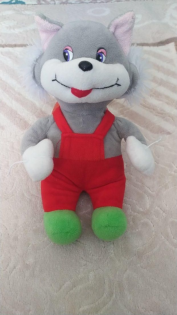 Kırmızı tulumlu ve yeşil ayaklı gri peluş kedi oyuncak, yumuşak ve sarılmaya uygun. Marka temsilidir.