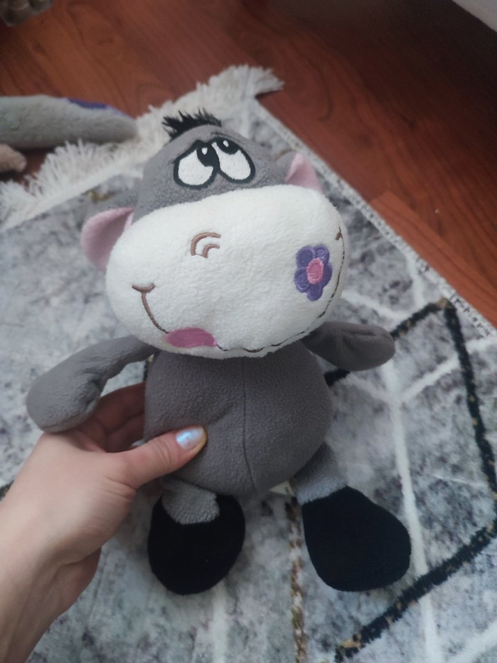 Nakışlı yüz detaylarına sahip, yanakta çiçek deseni bulunan yumuşak gri peluş oyuncak. Sarılmak için uygun.