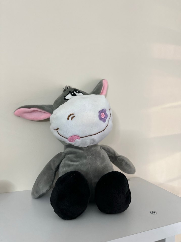 Yumuşak gri peluş eşek oyuncak, işlenmiş yüz detayları ve pembe iç kulaklarla. Siyah ayakları ve sevimli ifadesi var.