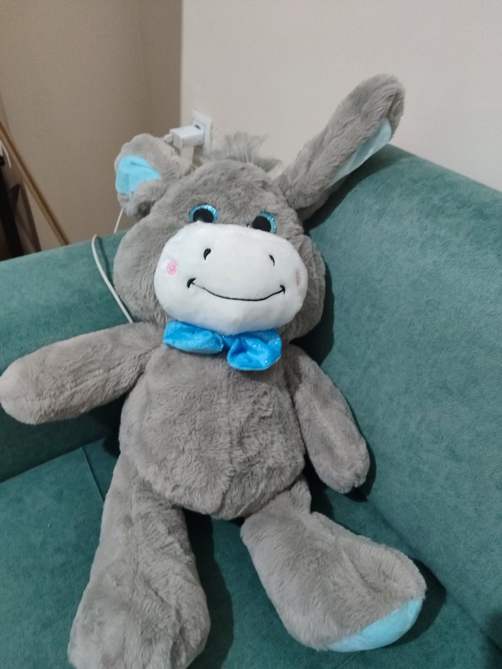 Mavi detaylı, yumuşak gri peluş oyuncak eşek, sarılmak için uygun. daha yeni aldım.