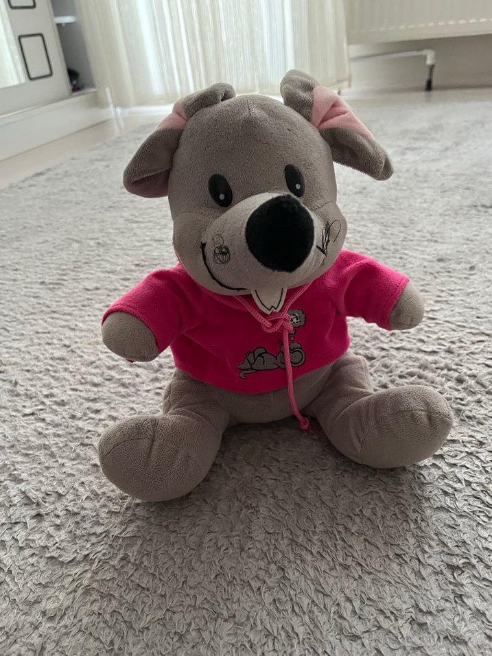Pembe kapüşonlu gri peluş fare oyuncak, yumuşak ve sarılmaya uygun.