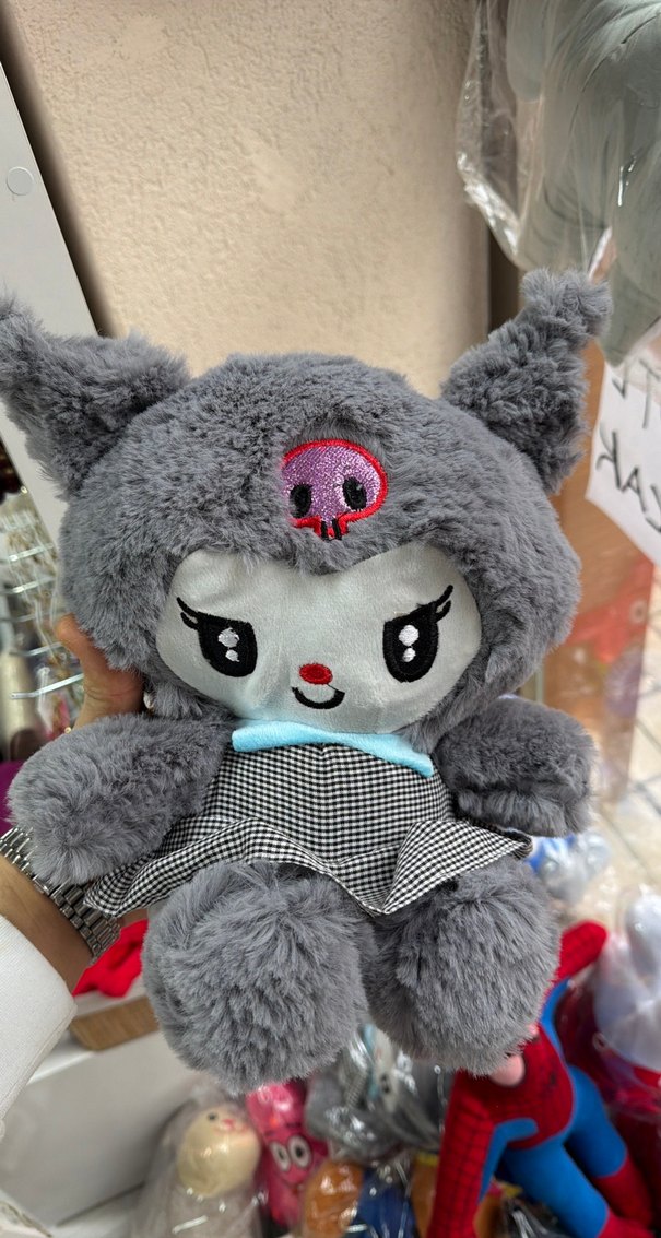 Gri peluş oyuncak, işlenmiş göz ve buruna sahip sevimli kedi figürü ile birlikte kareli etek giymektedir. Yumuşak ve sarılmalık.