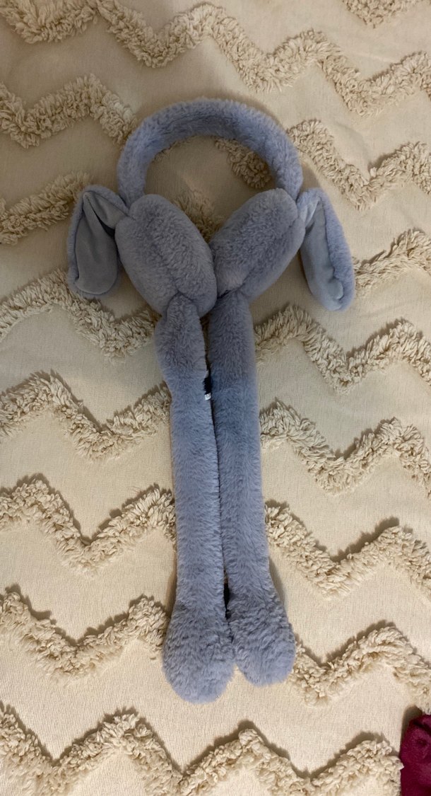Gri peluş oyuncak kulaklık, uzun ve yumuşak sarkıtlar ile kulak şeklinde detaylara sahip. Rahat ve yumuşak dokulu.