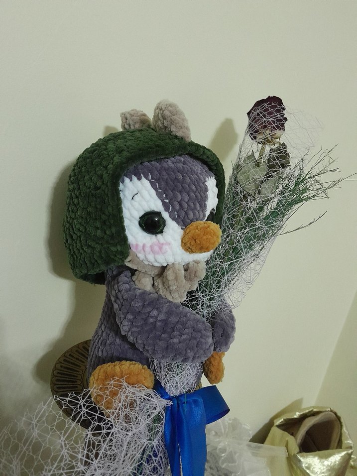 Yumuşak gri peluş penguen oyuncak, yeşil şapka takıyor ve mavi kurdeleyle bağlanmış dekoratif dallar tutuyor.