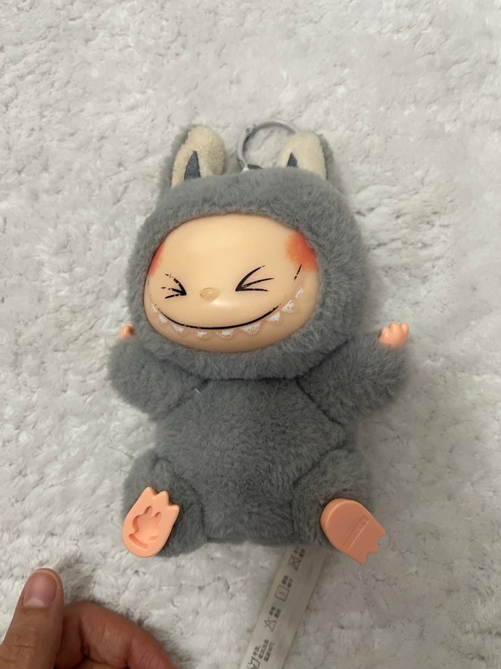 Gri renkte, yumuşak tüylü peluş oyuncak, gülen yüz ve küçük kulaklara sahiptir. Eller ve ayaklar pürüzsüz malzemeden yapılmıştır. Kabubu
