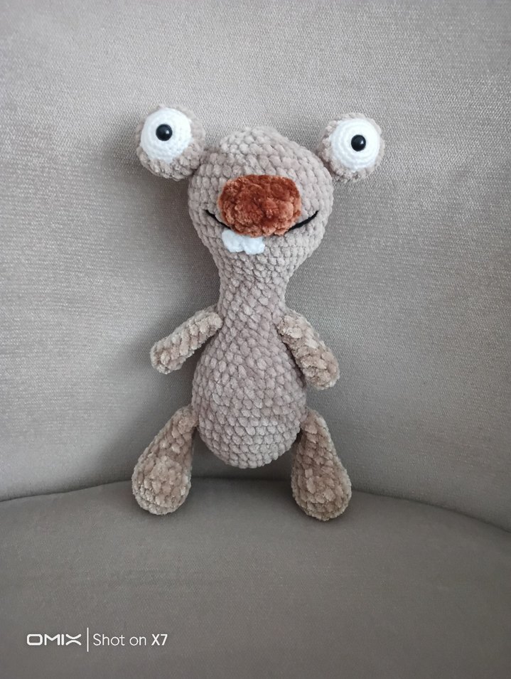Yumuşak dokulu, büyük gözlü ve gülümseyen yüzlü gri peluş oyuncak. 23 cm boyunda kadife ipten orulme buz devri Sid