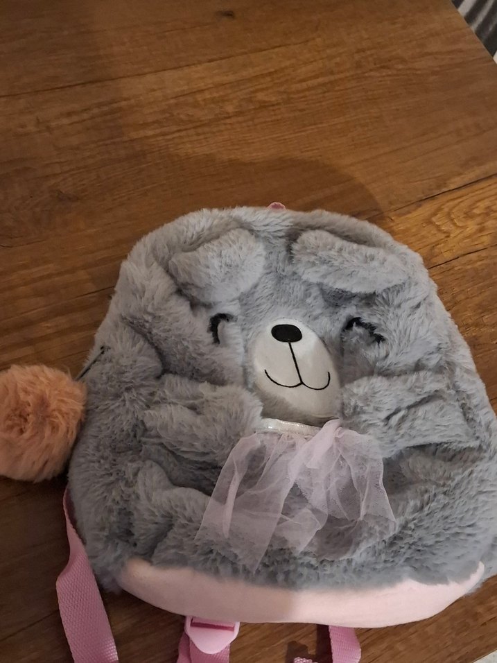 Yumuşak gri peluş Sırt destekli kız çocuk çantası, kulaklı sevimli hayvan yüzü ve pembe fiyonk detaylı. Rahat askıları bulunur.