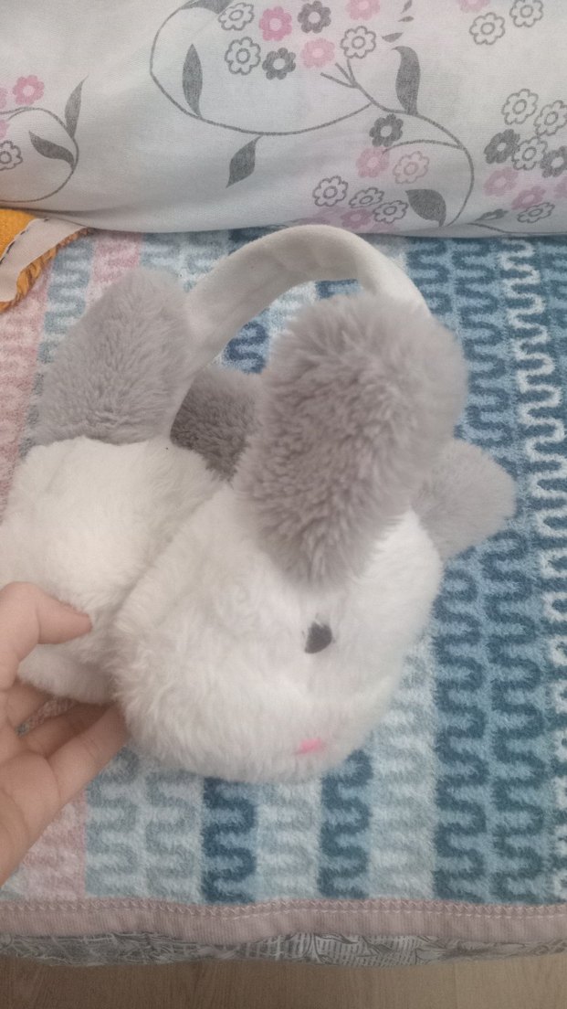 Yumuşak gri ve beyaz peluş tavşan kulaklık, rahat bir kafa bandıyla sıcak tutar.