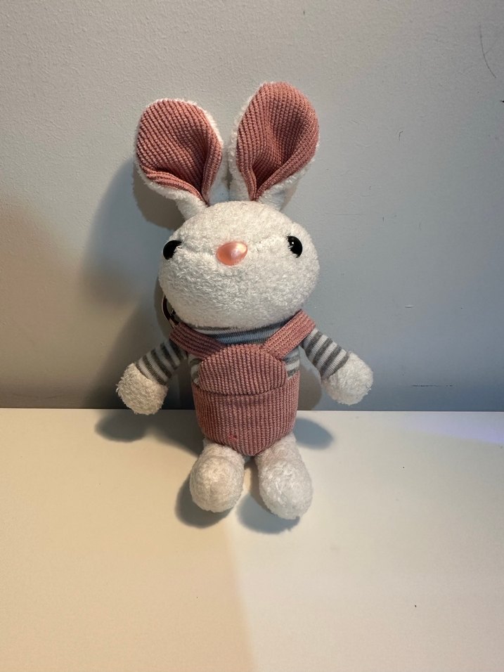 Yumuşak gri peluş tavşan oyuncak, pembe kıyafet ve çizgili kollara sahip. Büyük kulakları ve sevimli nakışlı burnu var.