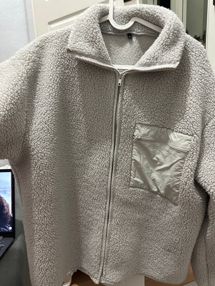 Kadınlar için gri peluş kumaştan, kürk detaylı, uzun kollu ve çıtçıtlı yakalı ceket. Rahat kesimli ve günlük kullanıma uygun.