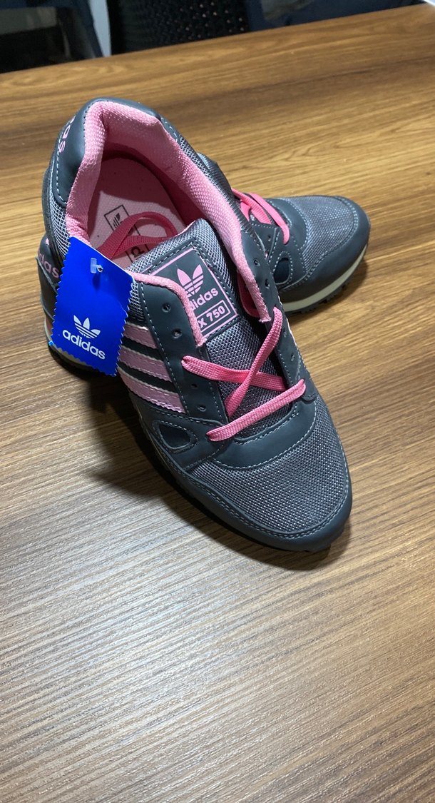Gri baskılı tasarıma ve pembe detaylara sahip Adidas kadın spor ayakkabısı. , trend sokak stiline uygun.