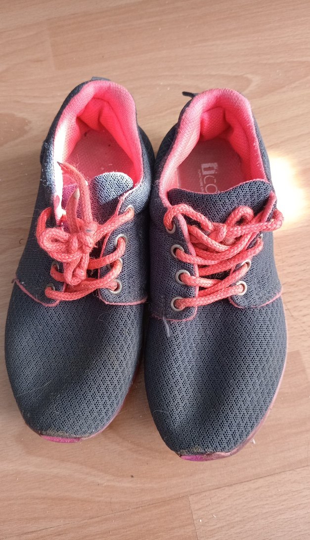 Bağcıklı, düz tabanlı, gri dış yüzey ve pembe bağcık ile astara sahip, nefes alan malzeme ve kauçuk tabanlı çocuk spor ayakkabısı.
