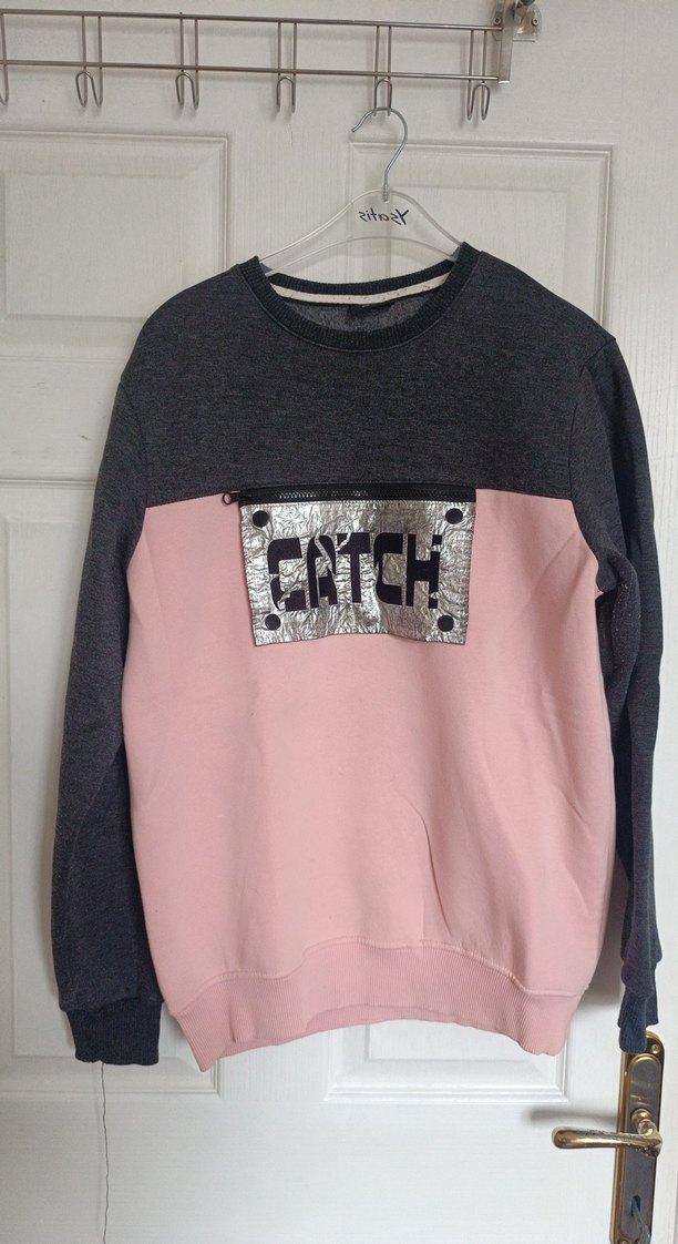 Uzun kollu, yuvarlak yaka ve bol kesime sahip kadın sweatshirtü. Gri ve pembe renk bloklu, yumuşak sentetik kumaştan, önünde fermuarlı baskılı detay bulunur.