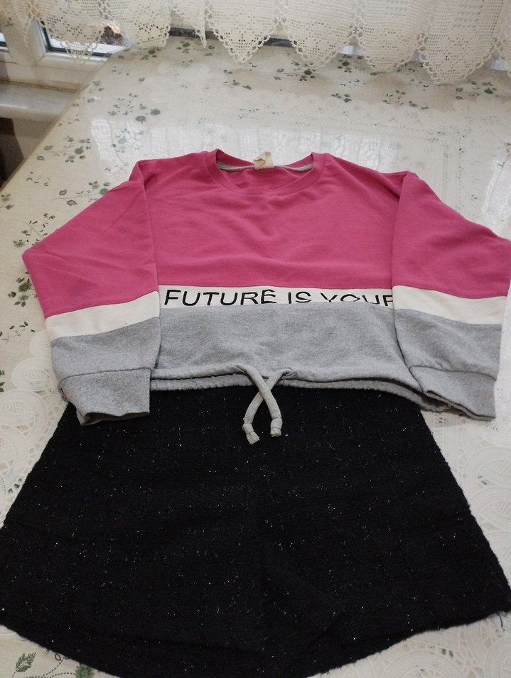Gevşek kesim, kısa uzunlukta, uzun kollu ve bisiklet yaka. Pembe ve gri renk bloklu, "FUTURE IS YOU" baskılı, bağcıklı etek ucu detaylı crops sweatshirt. Günlük sokak stili için uygun