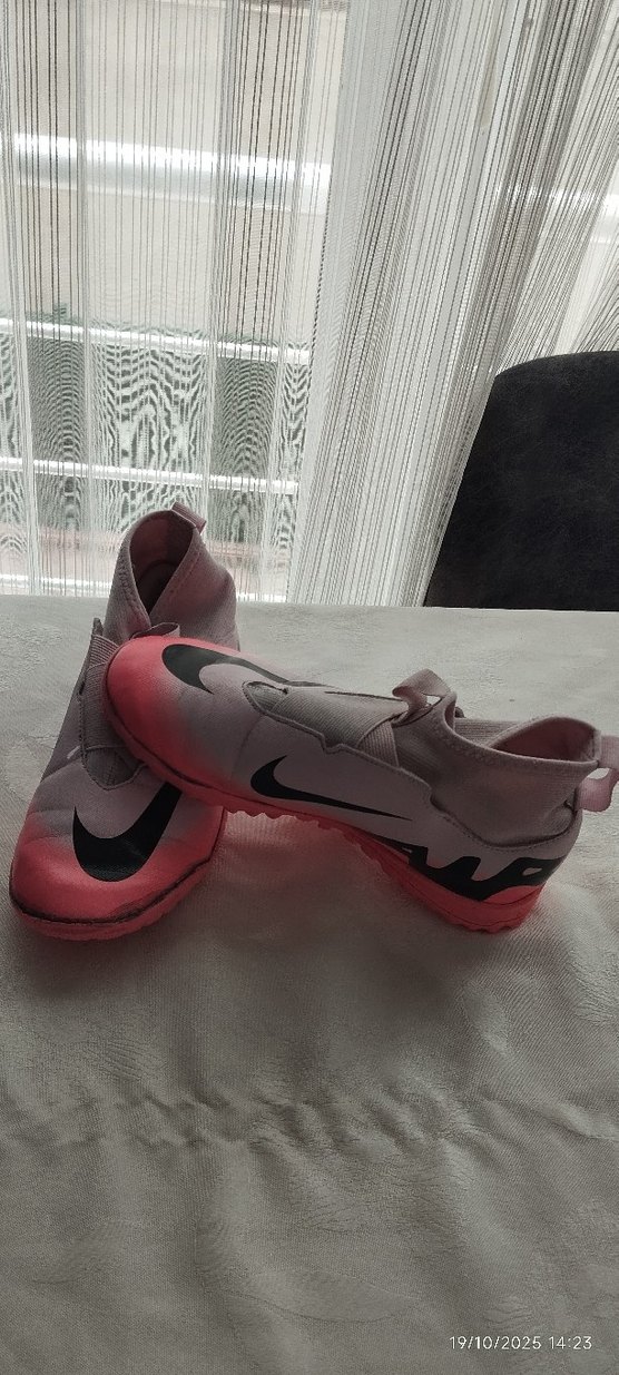 Gri ve pembe renklerde, Velcro kapamalı erkek ve kız futbol ayakkabısı. Kauçuk tabanlı, spor ve sokak stili için uygundur. ⚽