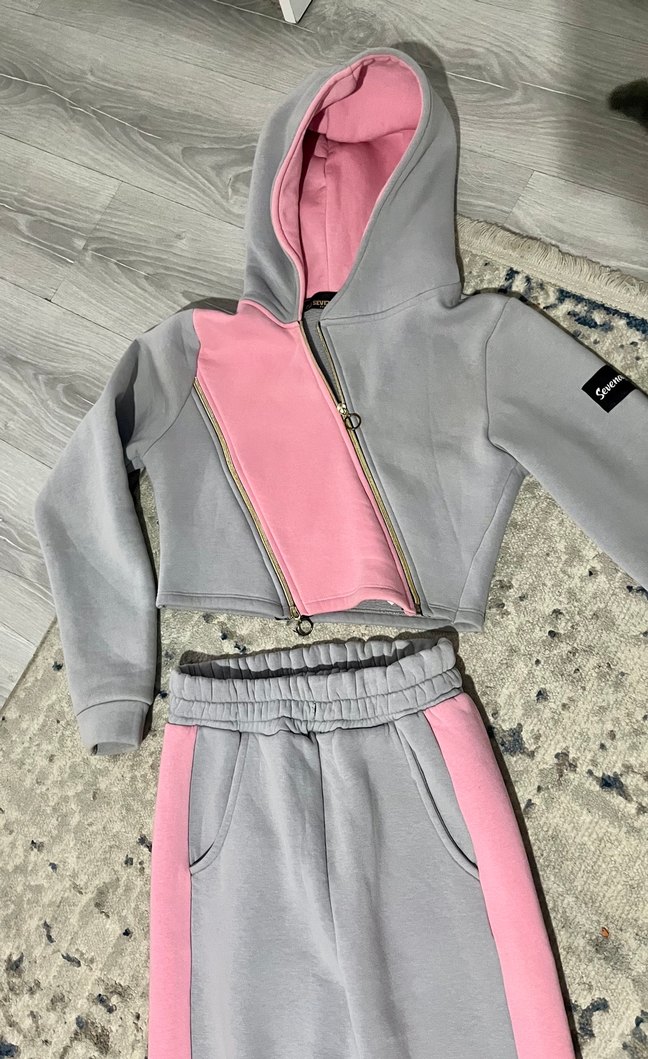 Gri Pembe Kapüşonlu Eşofman Takımı