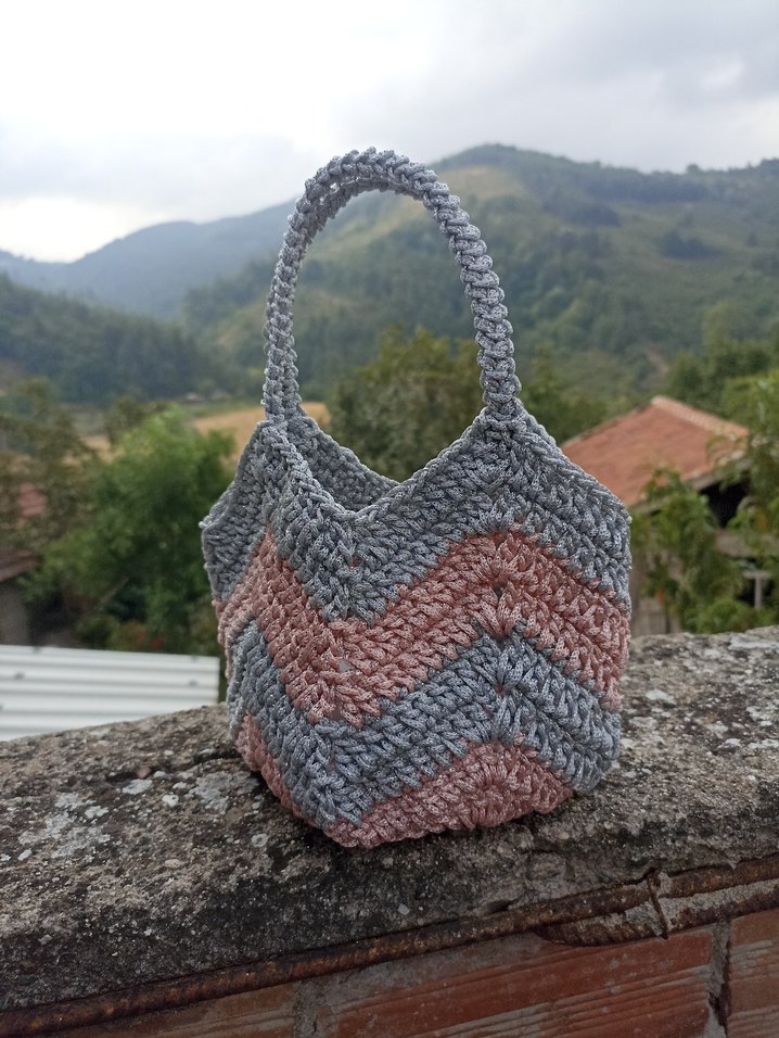 Gri pembe makrome ipten yapılmış, bohem tarzda, yumuşak dokulu ve gündelik kullanıma uygun el çantası.