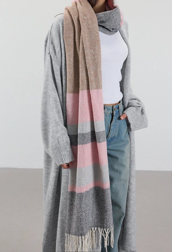 Kadınlar için örgü dokulu, gri ve pembe tonlarında, rahat ve normcore tarzda şal. Püskül detayları bulunur.