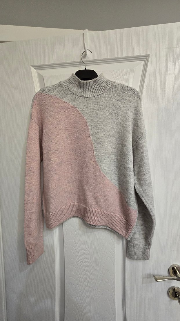 Kadınlar için örgü kumaşlı, boğazlı ve uzun kollu triko kazak. Gri ve pembe renk bloklu, rahat kesim, günlük kullanım için uygundur.