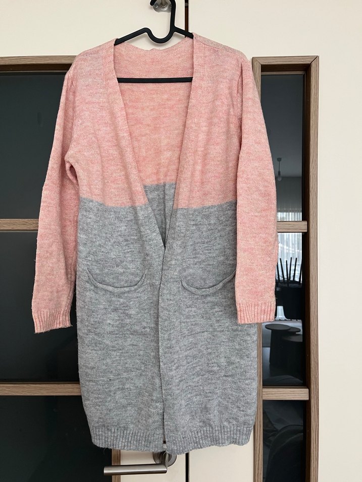 Kadınlar için uzun kollu, gevşek kesim, yaka detaylı, pembe ve gri renkli örgü hırka. İki cepli ve midi boyda, günlük kullanıma uygun rahat bir tasarım.