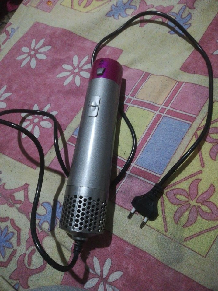 Güç kablosu ve kolay kullanım için düğme bulunan gri ve pembe renkli saç kurutma makinesi. Kompakt tasarıma sahiptir. ♀️