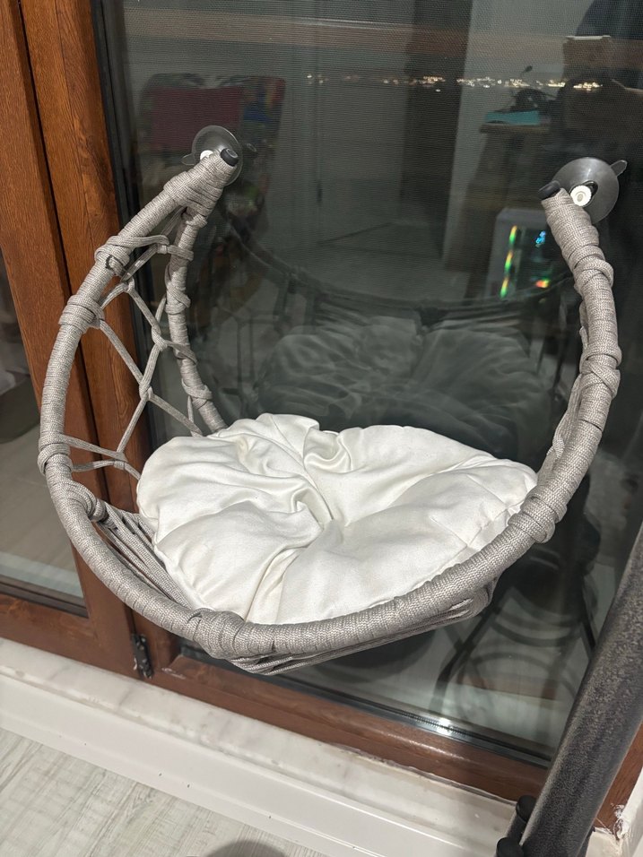 Gri renkte, pencereye vantuzlarla monte edilen yuvarlak askılı kedi yatağı. İçinde yumuşak beyaz minder bulunur. Kedimiz yatmadığından satıyorum