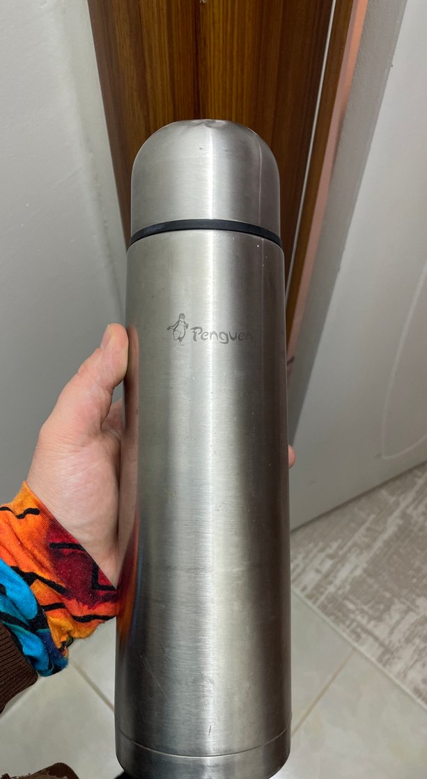 Gri Penguen çocuk termosu, içecekleri sıcak veya soğuk tutar. Dayanıklı metal gövde ve sızıntıyı önleyen kapak içerir.