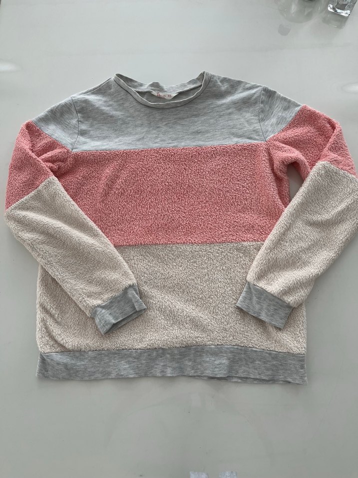 Uzun kollu, yuvarlak yaka kadın sweatshirtü, yumuşak ve sıcak kumaştan üretilmiştir. Gri, pembe ve bej renk bloklu, rahat kesimdir. Yırtma vs yok
