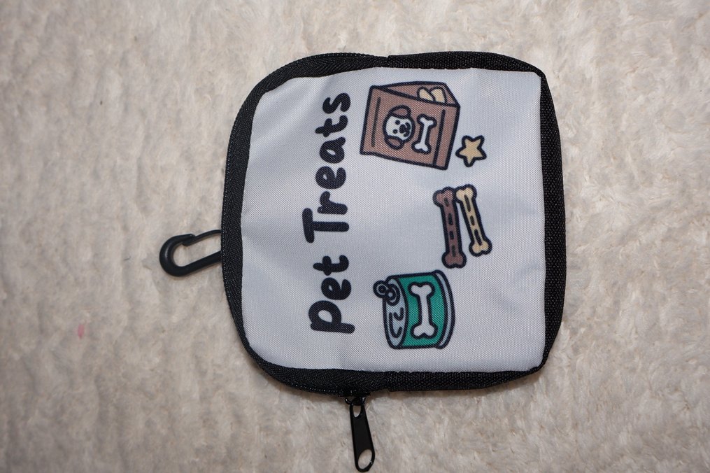 Fermuarlı gri köpek atıştırmalık çantası, sevimli köpek ödülleri ve mama çizimleriyle süslenmiş. Yürüyüşlerde atıştırmalık taşımak için uygun.
