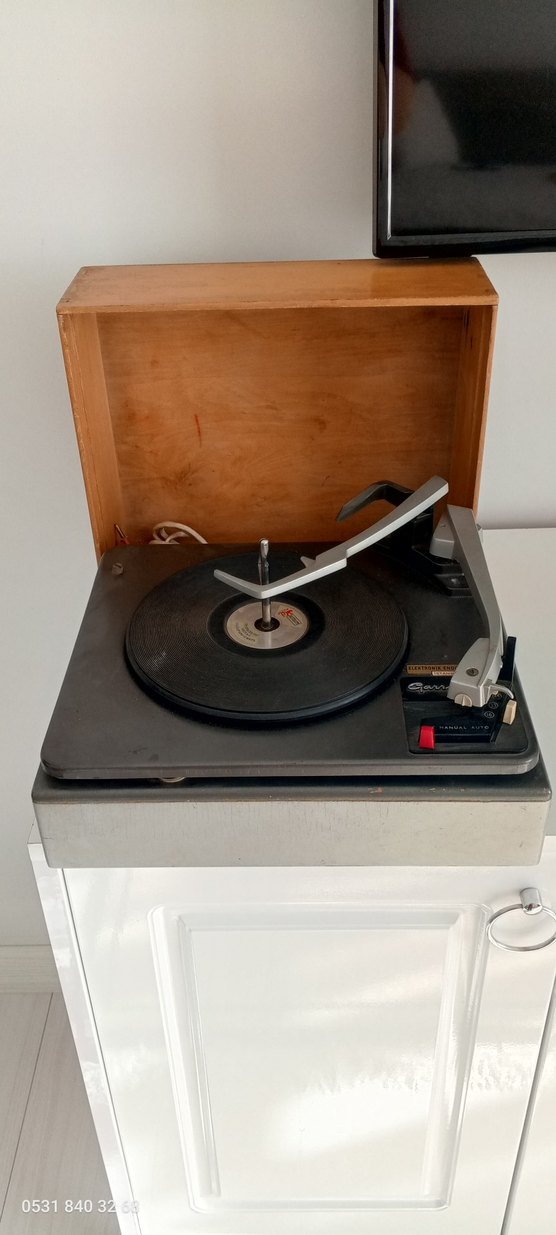 Gri renkli müzik sistemi, vinil plak çalmak için ahşap kapaklı eski tip pikap içerir. Ürün çalışmıyor Resimde göründüğü gibidir
