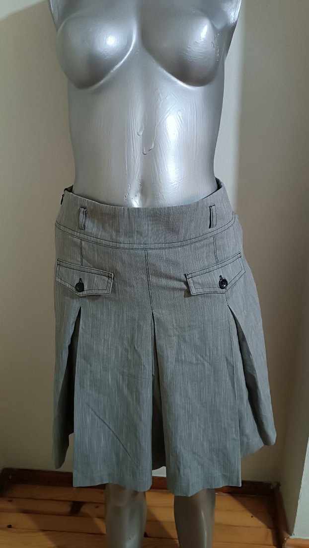 Kullanılmamıştır, yandan fermuarlı pileli, uzunluğu 53 cm, bel eni 37 cm dir