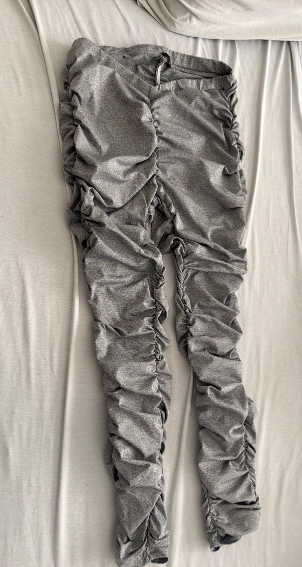 Gri kumaştan, pile detaylı ve vücuda oturanuzunlukta kadın tayt. Sokak modasına uygun avant-garde tarzda, günlük kullanım için ideal.