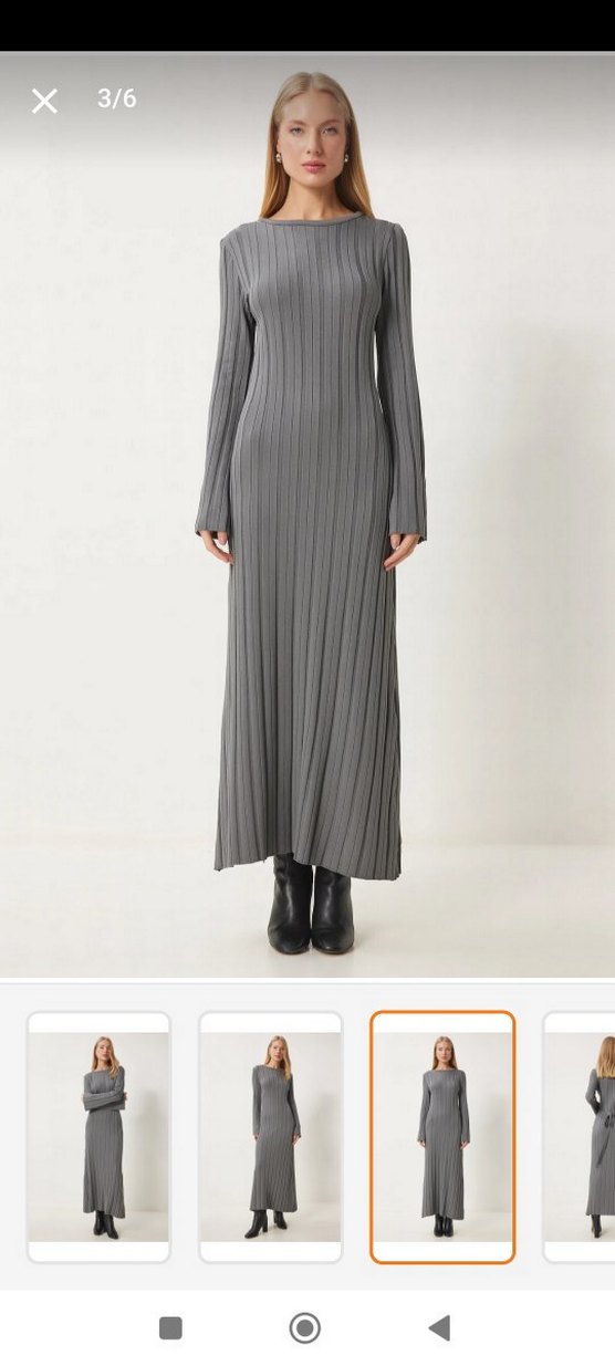 Yumuşak sentetik kumaştan yapılmış, pileli detaylara sahip, yüksek yakalı ve uzun kollu gri uzun elbise. Minimalist ve avangart tarz için uygundur. Sağuk örme triko elbise sm bedene uygundur