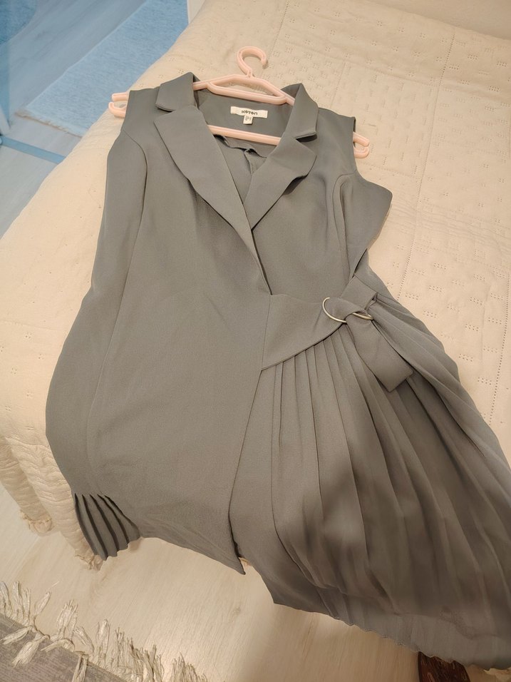 Gri renkte, pileli detaylara sahip, yakası kesik uzun kollu elbise. Sentetik kumaştan üretilmiş, rahat kesim ve ofis kullanımı için uygundur.