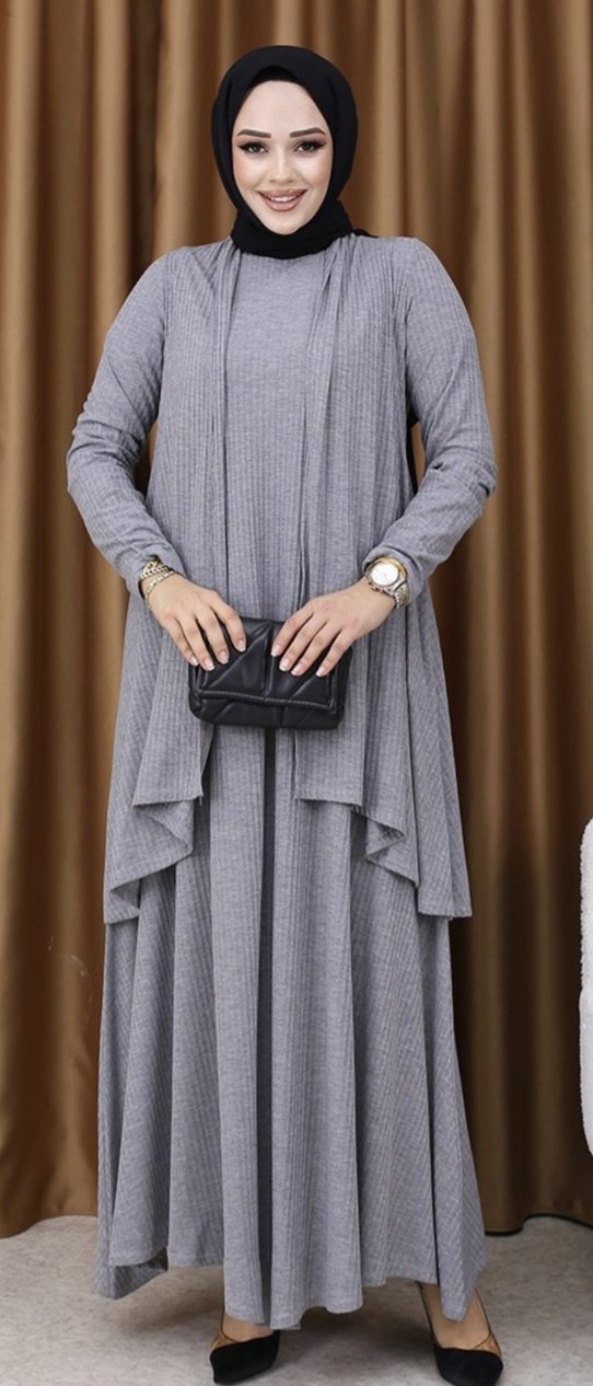 Gri renkte, pileli uzun elbise, yüksek yakalı ve uzun kolludur. Rahat kesimli, yumuşak sentetik kumaştan yapılmıştır. Sade ve günlük kullanıma uygundur.
