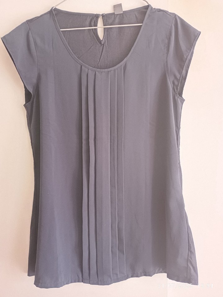 Gri renkte, pileli ön detaylı, V yakalı kolsuz bluz. Sentetik kumaştan, rahat ve dökümlü kesime sahip, günlük kullanıma uygun