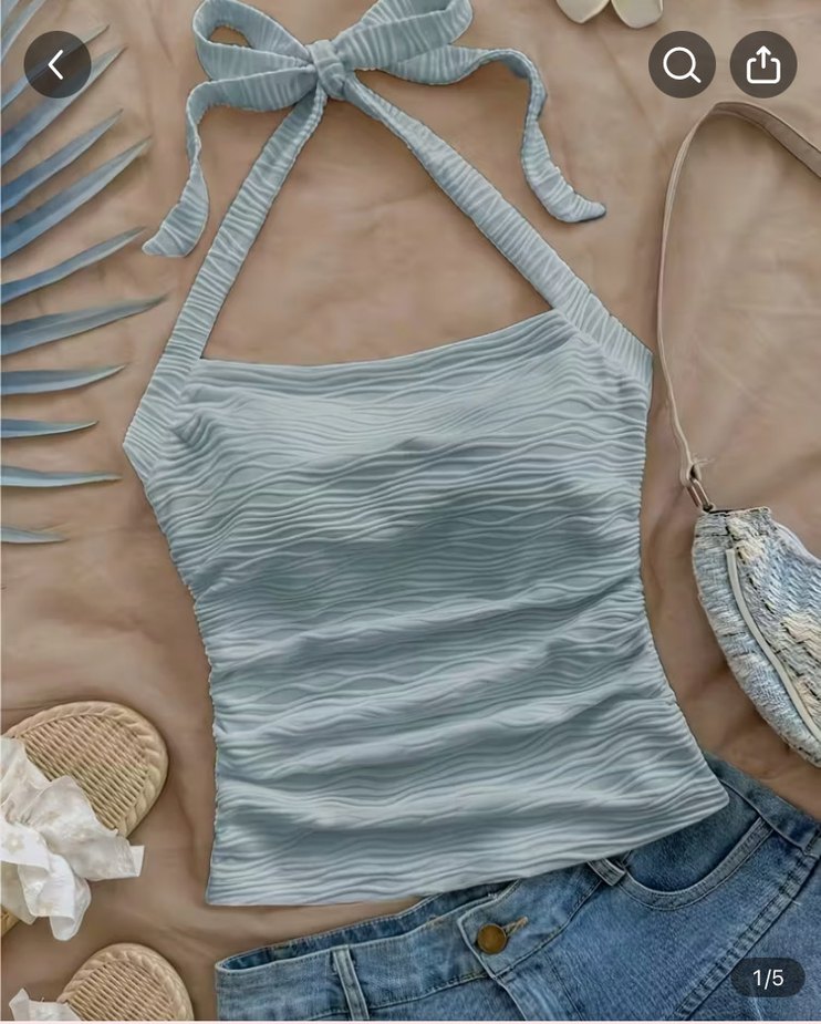 Gri renkte, askılı ve pilili dokulu, keten kumaştan yapılmış, kısa ve vücuda oturan kadın üstü. Günlük sokak tarzına uygun.