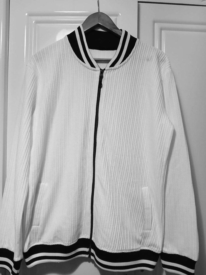 erkekler kadınlrar için pilili dokulu, uzun kollu ve bisiklet yaka spor ceket. Normal kesim ve midi boyda, rahat ve günlük kullanım için uygun. beyazrenkte, yakada, manşet ve etek ucunda siyah-beyaz çizgiler bulunur.