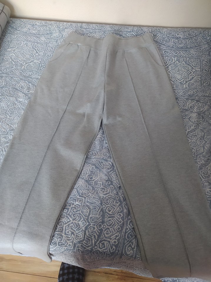 Gri renkte, pilili detaylara sahip, midi boyda, rahat kesim kadın eşofman altı. Yumuşak sentetik kumaştan, günlük kullanıma uygun.