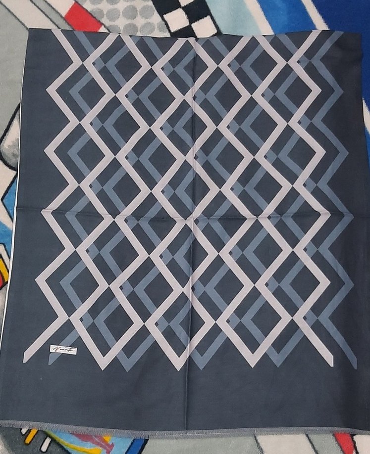 Gri renkte pilili ve geometrik desenli, yumuşak sentetik kumaştan yapılmış kadın fular. Avant-garde tarzı sevenler için uygundur.